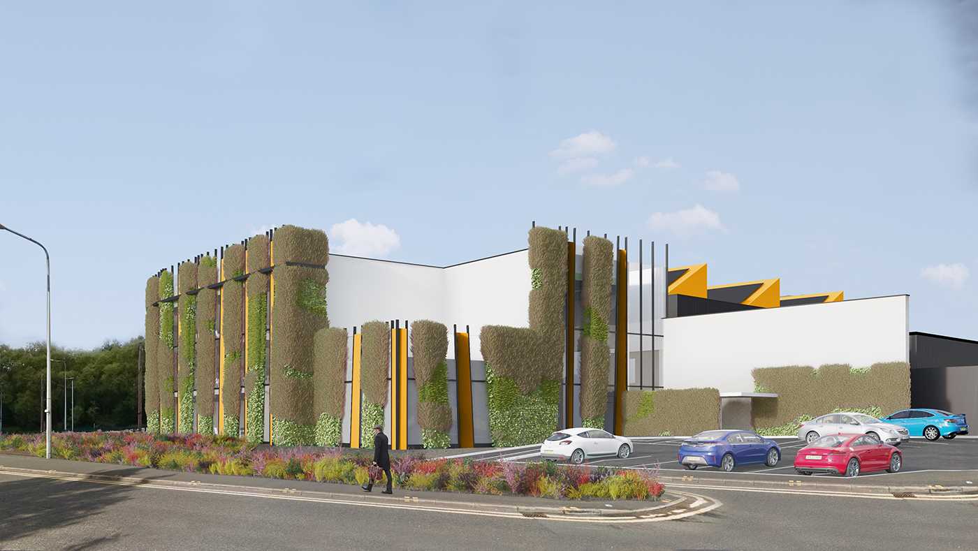 The Administration buildings vertical green panels appear to merge together giving the impression of a continuous wall of plants, designed to integrate with a curtain wall system which extends from the green embankment wrapping around the building and continuing along the road as a green wall. This green element is extended to the top of the building with a ‘Green roof', both elements seek to minimise the buildings ‘Heat island' effect and with the use of grey water harvesting reduce the surge effect of rainwater runoff.